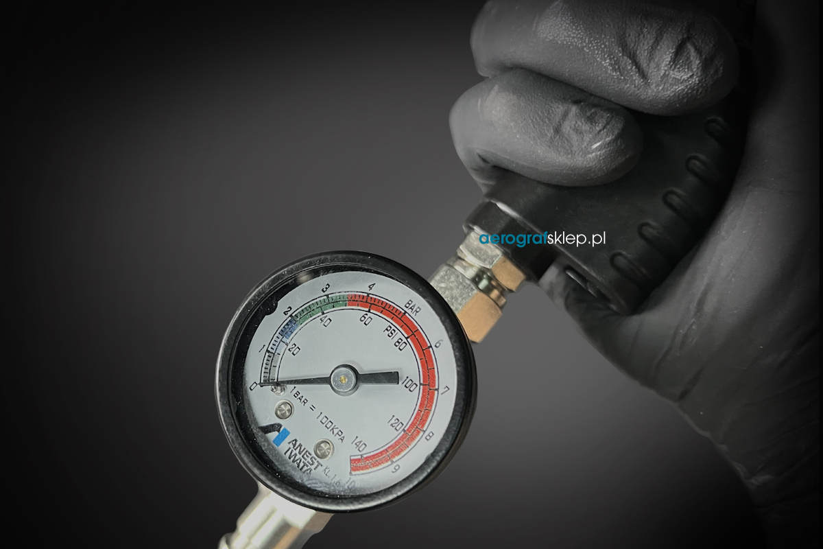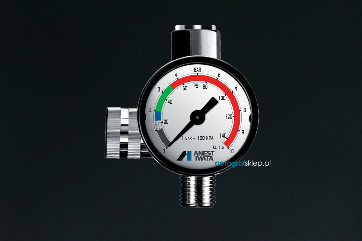 Manometr/regulator ciśnienia powietrza ze złączkami G1/4". Posiada chromowany aluminiowy korpus i zakres regulacji od